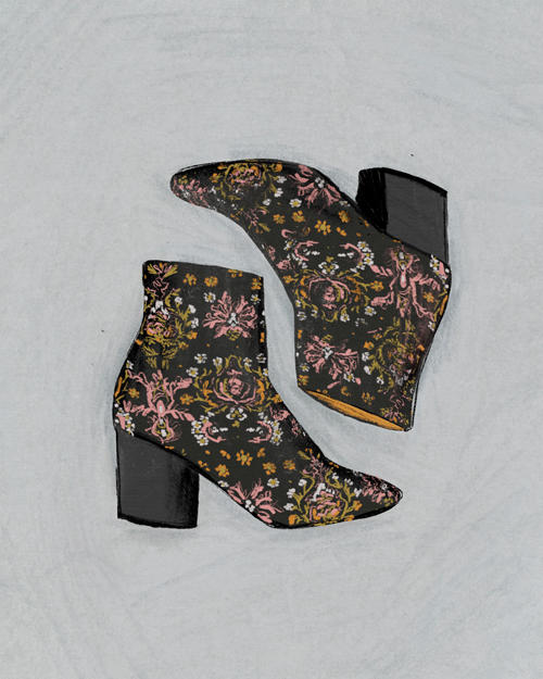 Dries Van Noten does exactly what he does best with these floral-jacquard ankle boots: a combination of texture and print done with masterful finesse. Pair with a clash of pattern for maximum effect.