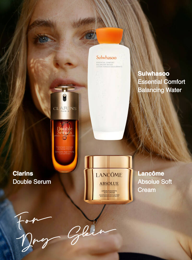 Building a skincare regimen that emphasises moisture is the most important thing to make sure your skin stays nourished and hydrated. For dry skin, never skip moisturiser in your AM and PM routine, but especially at night when your skin recovers. Opt for cream-based moisturisers with ingredients like hyaluronic acid and ceramides. The JAUM Moisturizing Complex™ in Sulwhasoo’s Essential Comfort Balancing Water combines five potent ingredients for soothing hydration, while Lancôme’s Absolue Soft Cream nourishes and revitalises.