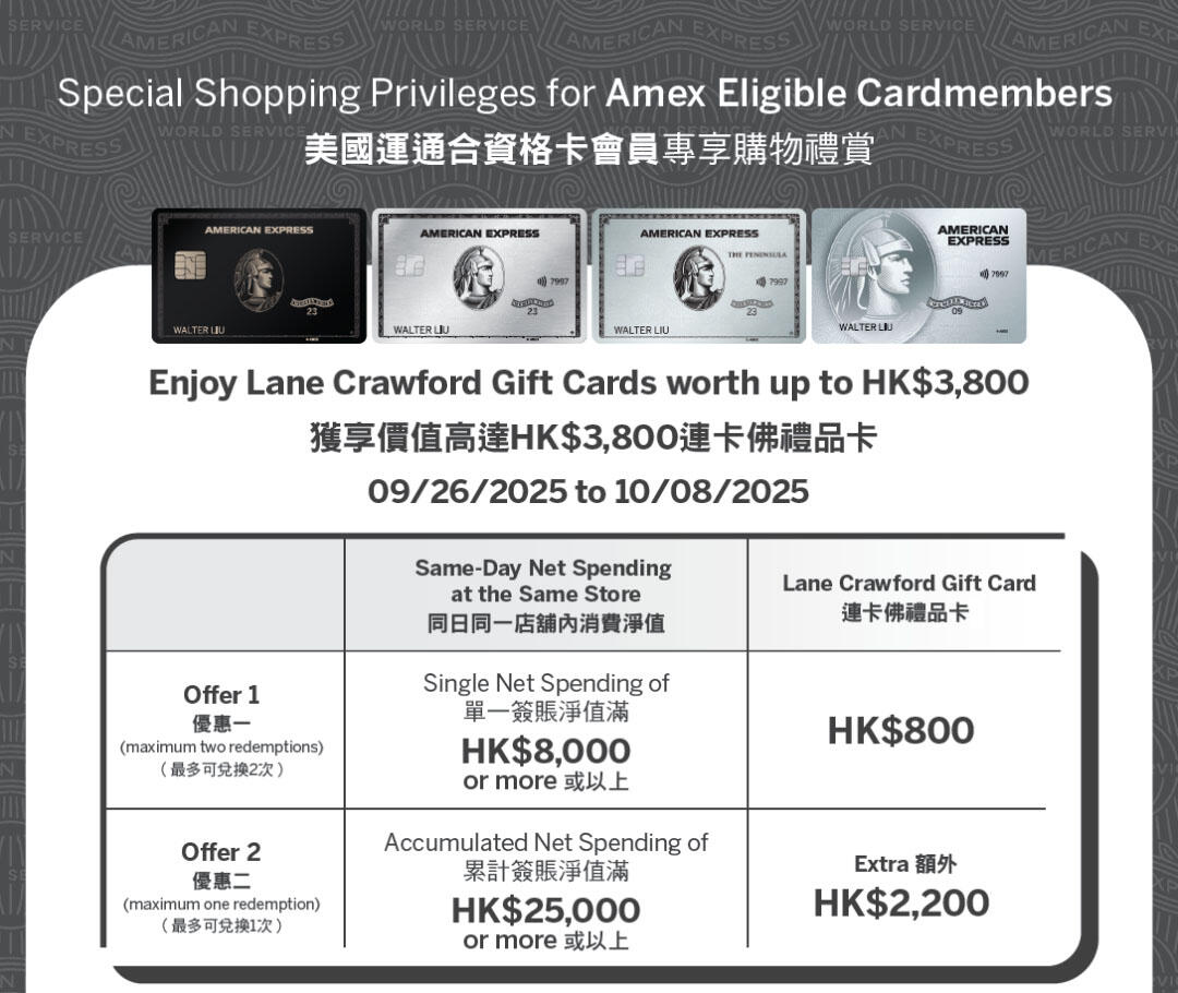- Offer 1: Upon a single net spending of HK$8,000 or more at any selected Participating Establishments, the Eligible Cardmember will be entitled to redeem one (1) Lane Crawford Gift Card (“Gift Card”) worth HK$800; and