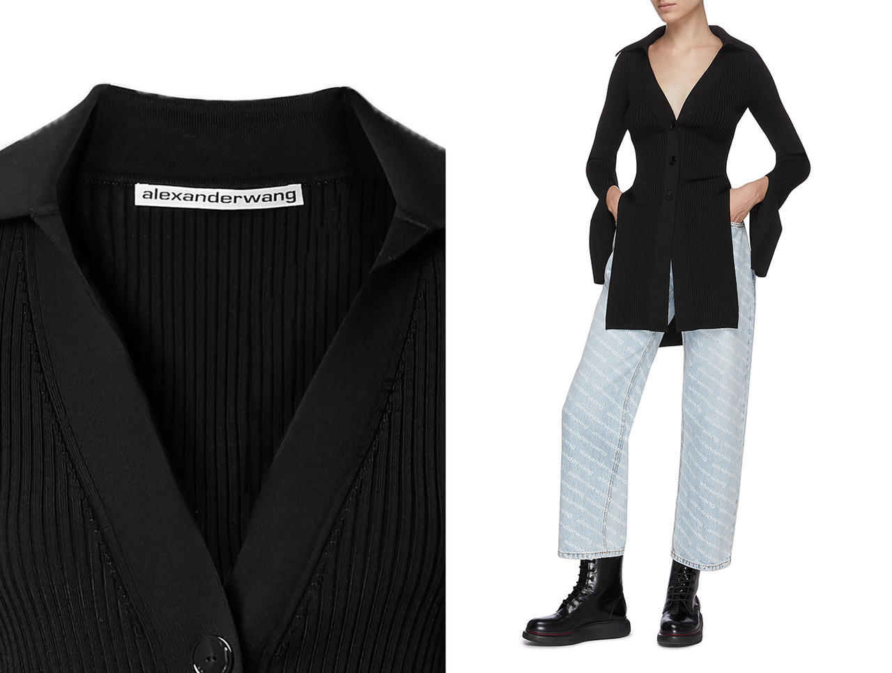 The A WANG girl is fun, irreverent — she inscribed the manual for off-duty style. She is dressed down by default, breezing through sun-drenched days in shiny slip dresses, white baby tees and frayed indigo denim — thrifted, of course. She prefers worn-in leather jackets to heavy knits, but loves the dramatic split cuffs on this cardigan.