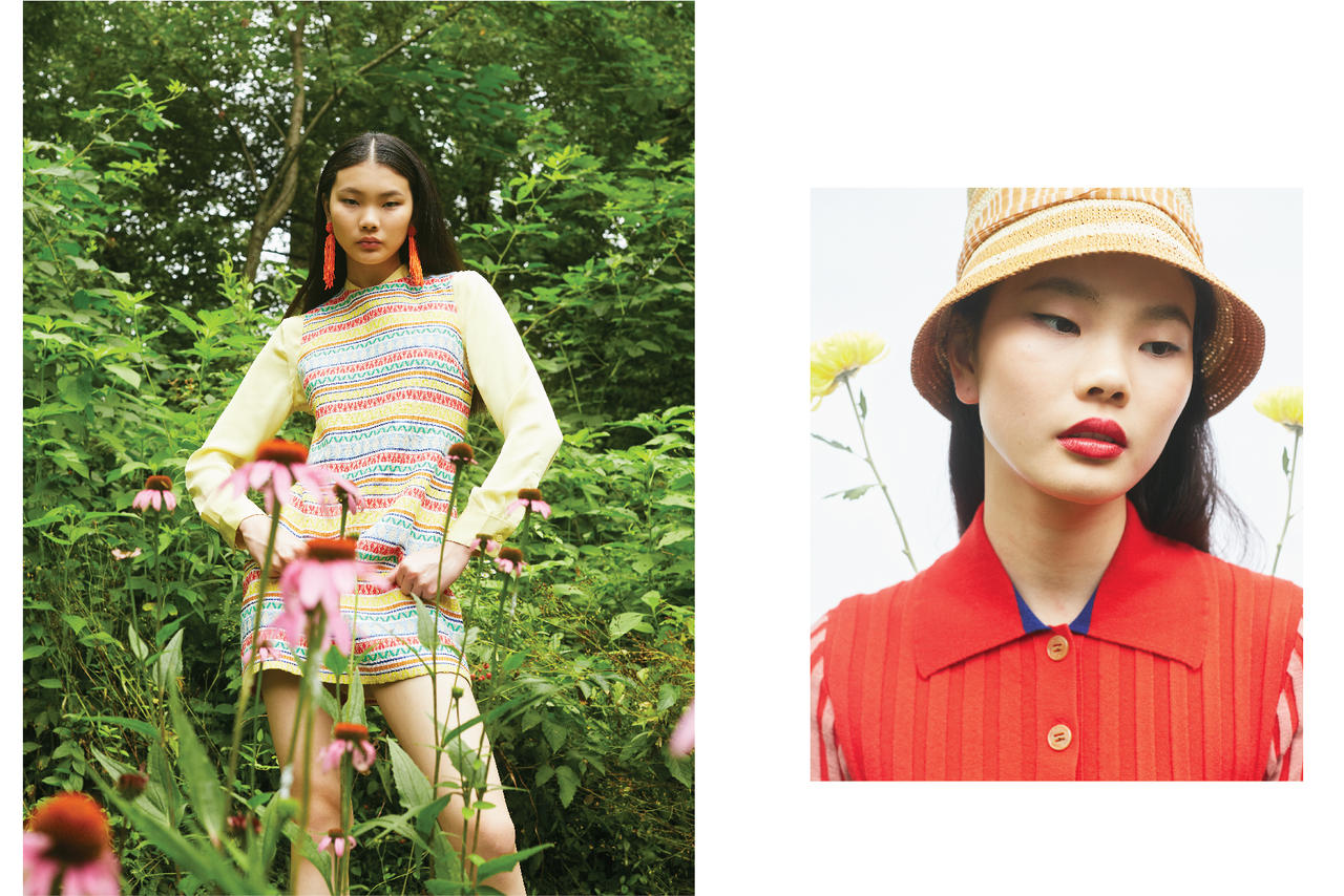 Left image: Dress Alice + Olivia, Shirt Equipment, Earrings Kenneth Jay Lane, Lipstick Charlotte Tilbury. Right image: Top Sonia Rykiel, Hat Sensi Studio, Lipstick La Bouche Rouge