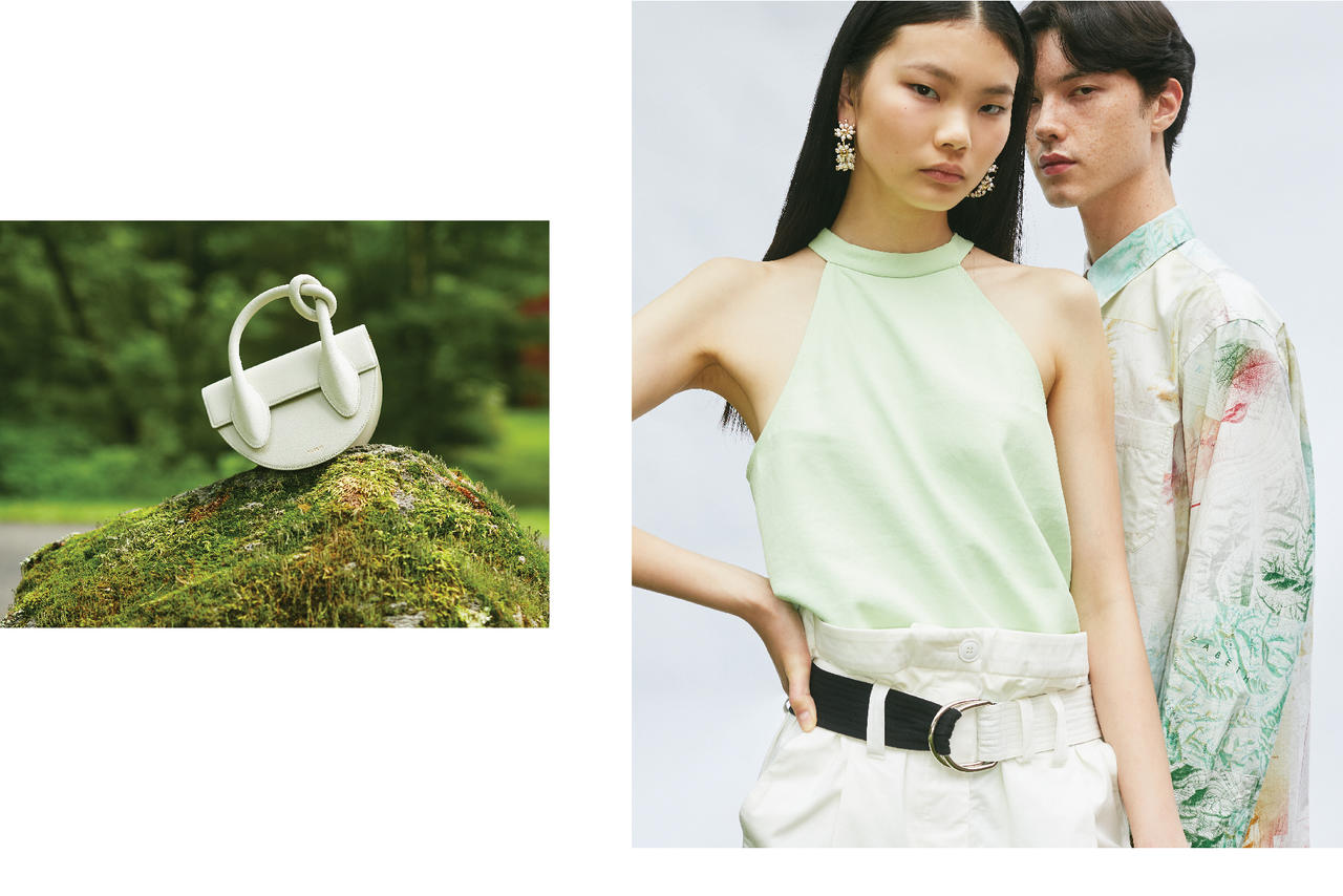 Left image: bag Yuzefi. Right image: shirt Acne Studios, top Tibi, trousers La Fetiche, earrings Rosantica
