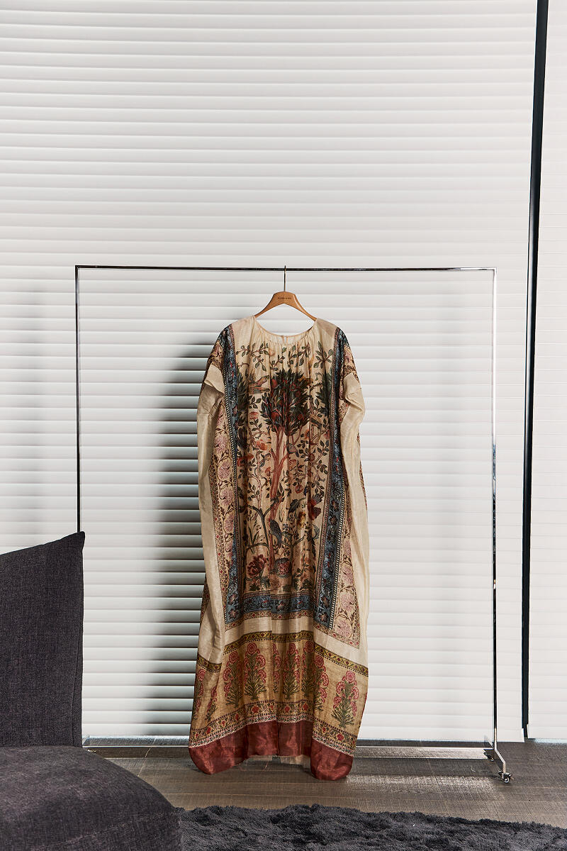 Crafted from a blend of imported French linen and hand-spun wild silk, it offers a matte, textured finish that resists wrinkling. The interior is luxuriously lined with soft mulberry silk, while custom-dyed lace trim at the sleeves adds an intricate detail.