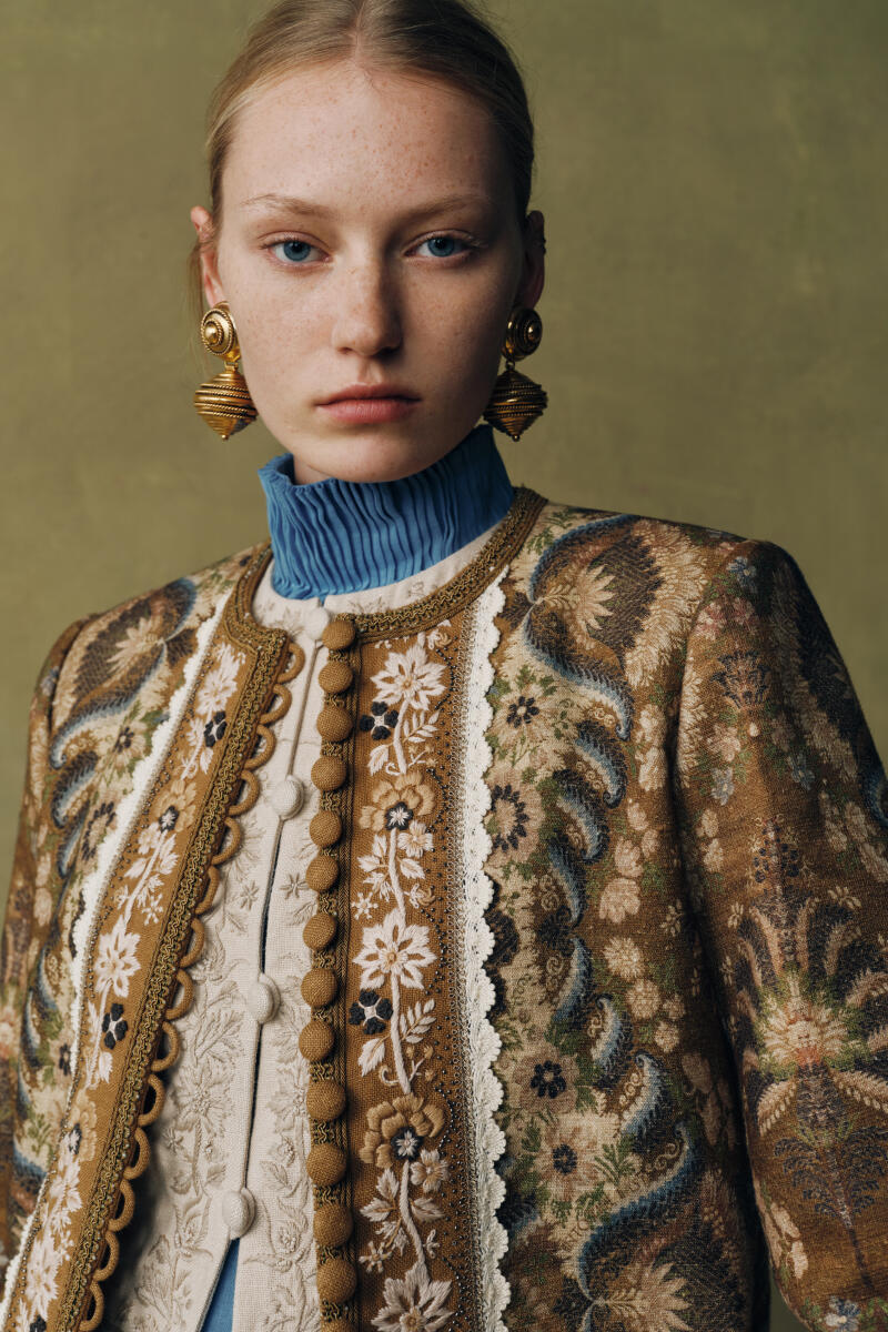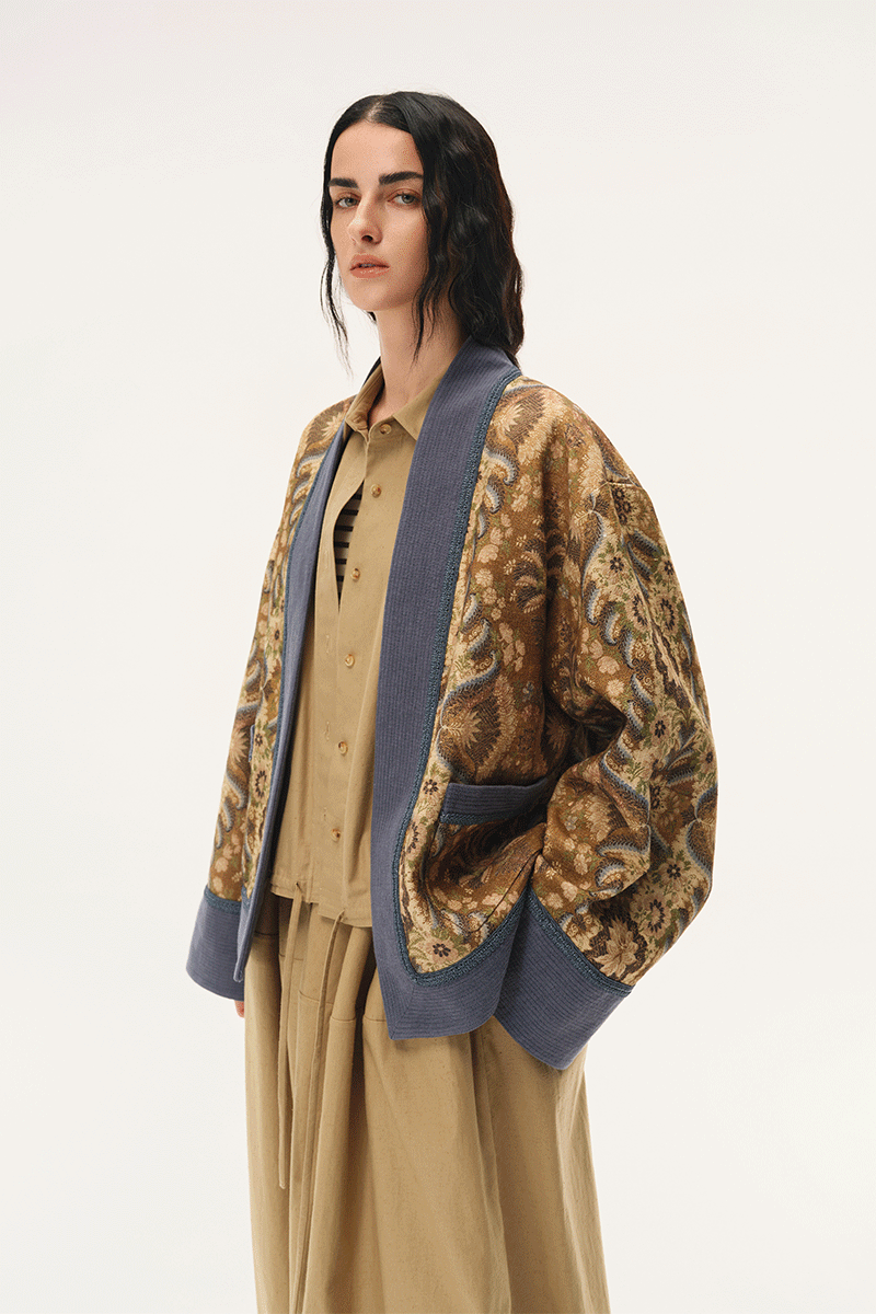 This open-front coat, infused with Eastern charm, embodies our signature silhouette, designed to evolve each season. Inspired by classic palm motifs and the lotus flower of the Nile, it features elegantly curled, fan-shaped petals for a distinctive, relaxed aesthetic.
