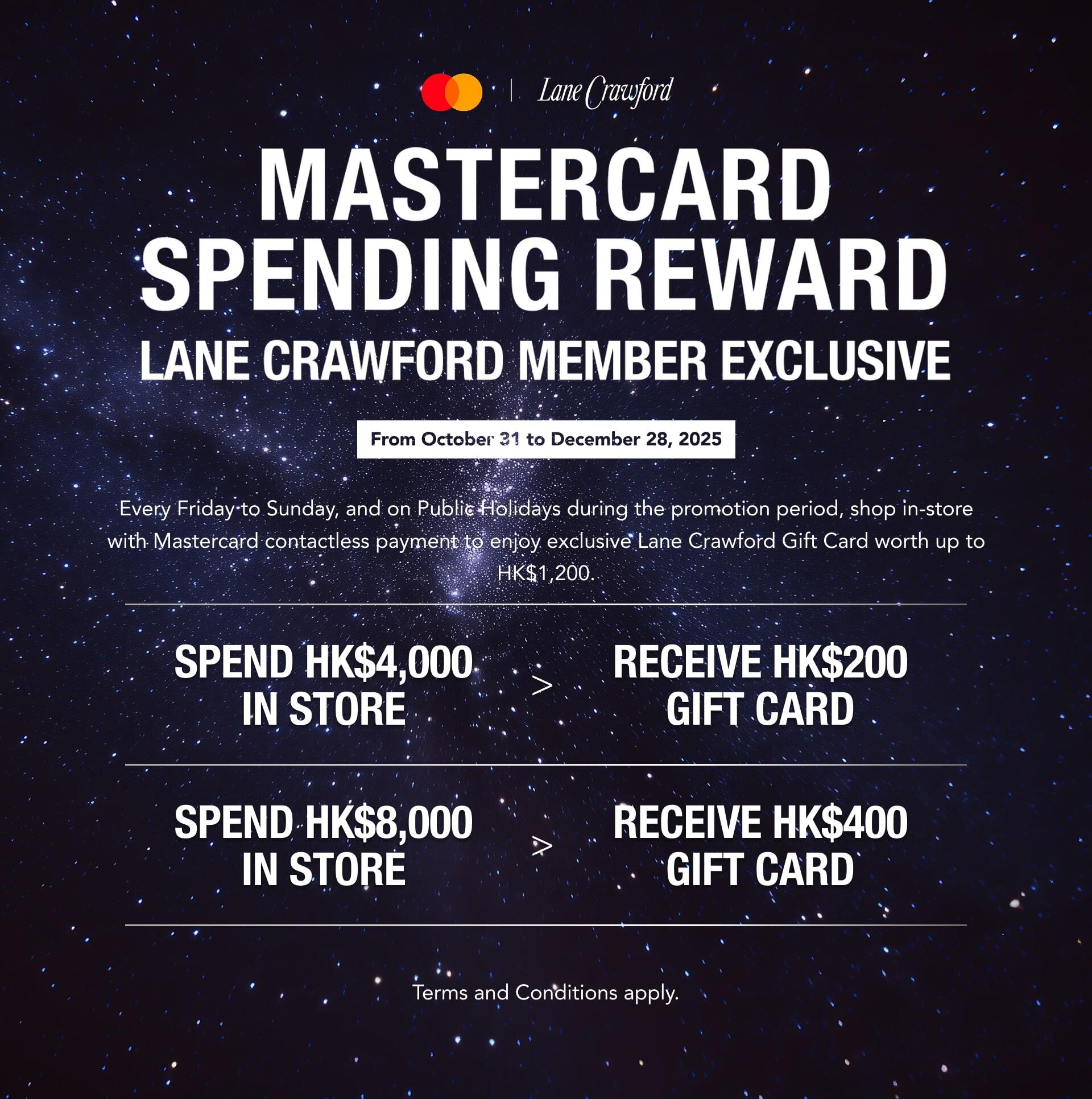 - Each Lane Crawford member can enjoy HK$200 Lane Crawford gift card upon single transaction of HK$4,000 and enjoy HK$400 Lane Crawford gift card upon single transaction of HK$8,000 with Mastercard contactless payment during the Promotion Period.