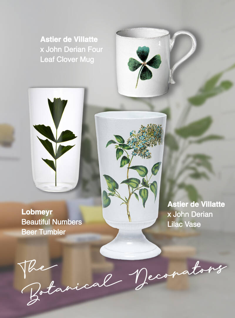 For plant lovers, infusing your dining experience with botanical decor transforms mealtime into a vibrant celebration of nature. Look no further than lush greenery as centerpieces – vases, mugs and beer tumbler with botanical prints from Astier de Villatte create a serene atmosphere that reflects your passion for gardening.