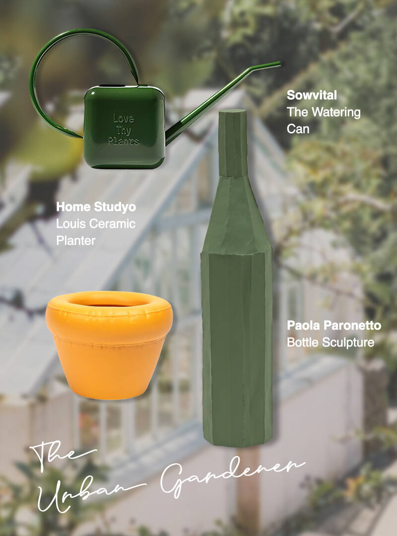 For an urban gardener, functional yet beautiful tools are key since you likely won’t have a gardening shed to hide away the gardening shears. A bottle sculpture from Paola Paronetto can double as a decorative object, while a ceramic planter and water can from Sowvital bring both style and functionality to your indoor garden.