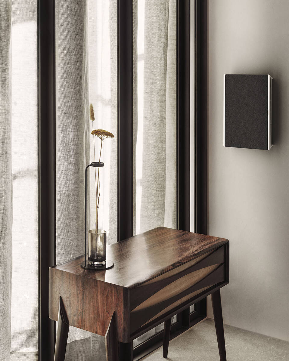 A hallmark of the Y3K style is the “fusion of metallic textures.” Embracing a futuristic aesthetic, the sleek sound systems from Bang & Olufsen, with their flowing curves in space gray and timeless black, create a harmonious balance of warm and cool tones within the space. The integration of high-tech elements, including LED lighting, touchscreens, and automated devices, not only elevates convenience and comfort but also embodies a visionary approach to the possibilities of future technology.