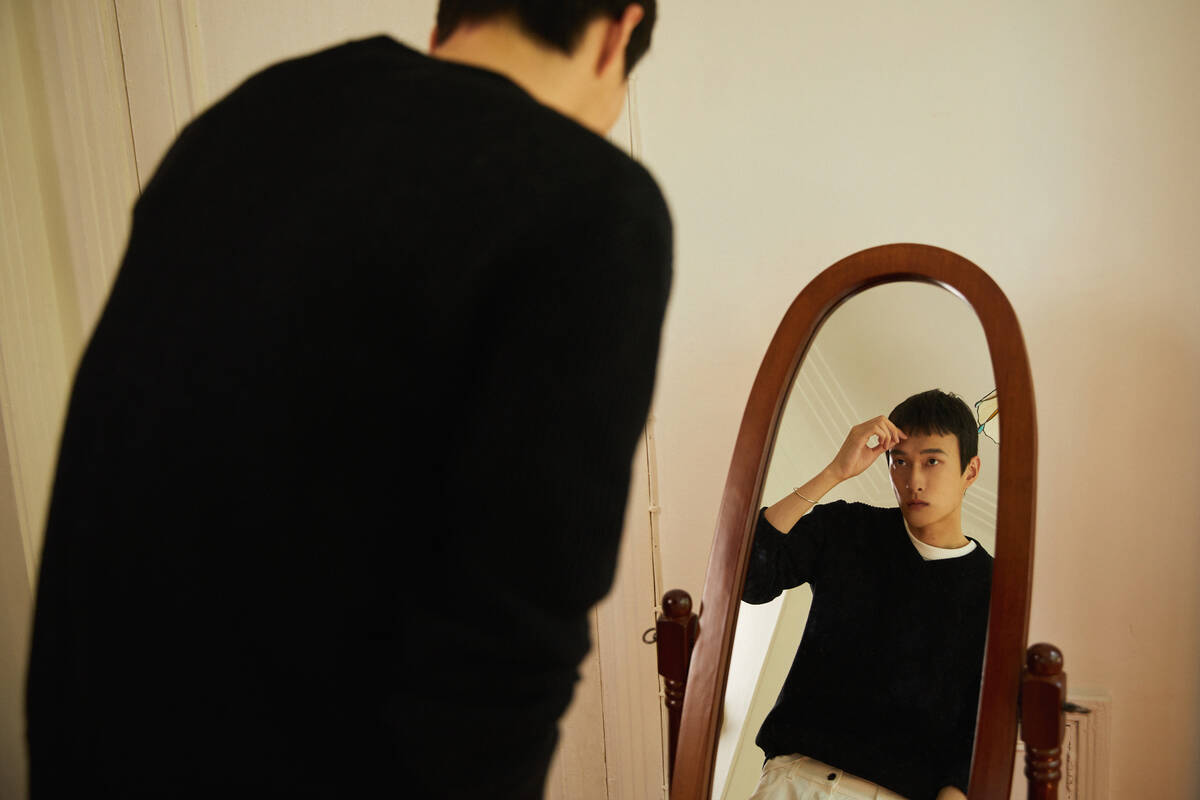 As Alex approaches the mirror, he gracefully shifts his stance, delicately adjusts his hair, and proceeds to examine every intricate detail of his reflection.