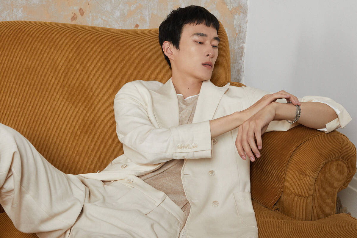 He lazily reclines on the sofa. His fingers toying with the bracelet adorning his wrist.