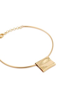 Step into a world of minimalist elegance with the Eliou necklace. This exquisite piece features a slender gold hoop gracefully holding a polished gold square pendant, which reflects light beautifully due to its mirror-like finish. The pendant's subtle textural details add an artistic touch, making it a versatile addition to both daytime and evening looks. Perfect for those who appreciate simplicity with a hint of sophistication in their jewellery.