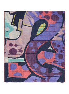Unleash your imagination with this ÉPICE scarf, featuring a dreamscape of surreal forms and vibrant hues. The dynamic swirls and abstract elements in shades of purple, blue, and orange create a visually stunning piece that speaks to the art lover’s soul.