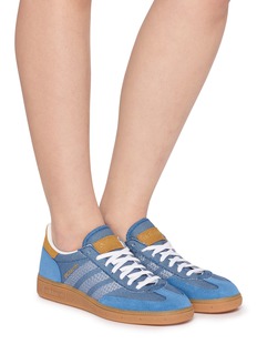 Adidas presents iconic Handball Spezial sneakers with signature three-stripe detailing and mixed-texture paneling for authentic retro sporting heritage. The lace-up silhouette with contrast lateral stripes and textured gum sole delivers vintage court-inspired styling, while streamlined low-profile construction and embroidered branding create a timeless essential for classic sportswear collectors and elevated casual dressing.