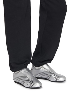 adidas presents the futuristic +F50 sneakers with a revolutionary laceless slip-on design and aerodynamic ribbed sculpting across the upper for streamlined performance. The molded construction with "+F50" branding and contoured lines reflects speed-focused engineering, while the grippy flat sole delivers precision control for athletic pursuits.