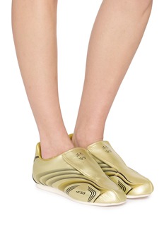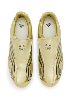 Adidas' TAEKWONDO F50 sneaker merges speed-driven design with futuristic aesthetics through its aerodynamic sculpted upper and contoured wave detailing. The low-profile silhouette features laceless slip-on construction with hook-and-loop closure, signature F50 branding, and a streamlined sole. Performance heritage meets contemporary sneaker style.