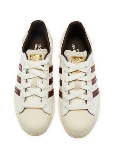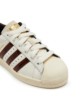 The Wales Bonner x adidas Originals Superstar Sneakers reimagine an icon through the lens of elevated craftsmanship. Detailed with tonal croc-embossed leather, contrast 3-stripes, and golden foil logos, the design balances retro rhythm with refined modernity—an ode to hip hop heritage and sartorial artistry.
