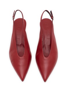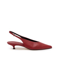 Step into sophistication with Aeyde's red leather slingback flats. These elegantly designed shoes feature a smooth, rich red leather finish that commands attention. The pointed toe and subtle kitten heel enhance the sleek silhouette, offering a blend of comfort and poised style. Perfect for transitioning from office wear to evening attire, these slingbacks are secured with a delicate ankle strap, ensuring both stability and a refined look.