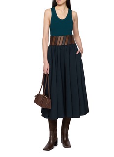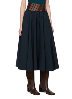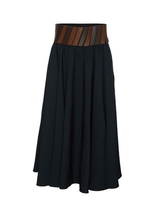 Sculptural elegance meets bold contrast in this ALAÏA skirt. The flowing skirt cascades into a soft flare, while the diagonal striped leather waistband adds a graphic, architectural edge. A masterful blend of fluidity and structure.