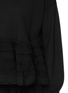 Alaïa amplifies volume with a sculptural sensibility in this wool-blend peplum top. The high neck and dropped shoulders anchor its oversized silhouette, cascading into intricate ruffled tiers that echo the house’s couture knit heritage. A dramatic yet effortless layering piece that elevates day-to-night dressing.