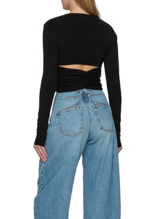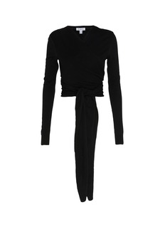 Crafted in a sumptuous cashmere blend, this wrapped knit top by Alaïa defines the waist through a fluid crossover construction that ties elegantly at the front. The long sleeves and sculpted fit bring a refined sense of ease, while the open-back detail introduces a subtle, modern sensuality—perfect for pairing with denim or evening tailoring.