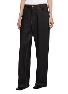 Alaïa reimagines denim through the softness of knit, crafting a sculpted, architectural silhouette that moves with unexpected fluidity. Designed with a low waist and full, elongated legs, this pair merges casual codes with couture precision—perfect for grounding sleek knits or offsetting eveningwear with modern nonchalance.