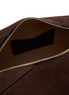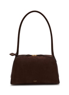 Experience the epitome of understated luxury with this Alaïa handbag. Crafted from sumptuous brown suede, this bag features a sleek, structured silhouette marked by clean lines and a minimalistic design. The elegant top handle and golden zipper add a touch of refined sophistication, while the subtle embossed logo ensures a discreet branding element.
