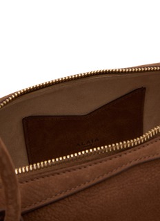 This Alaïa handbag, crafted in sumptuous brown suede, is a testament to understated luxury. Its sleek, elongated silhouette is perfectly complemented by an elegant, slender strap, making it ideal for both handheld and over-the-shoulder wear. The bag's clean lines are subtly enhanced by gold-tone hardware, adding a touch of refined glamour. A versatile companion for both day and evening wear, this piece is an exquisite addition to any sophisticated wardrobe.