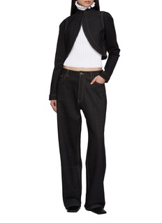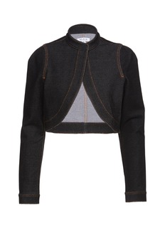 Architectural lines take centre stage in this cropped jacket, where Alaïa channels its sculptural heritage through a high neckline and a dramatic curved front opening. Cut from vintage-washed denim, the piece strikes a refined tension between structure and sensuality—ideal for pairing with pared-back knits or grounding voluminous silhouettes.
