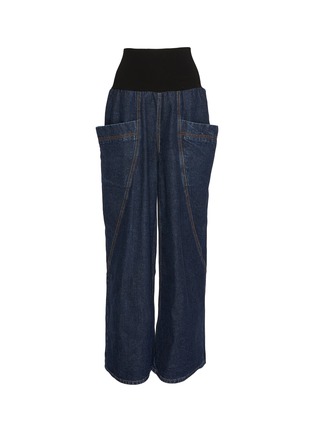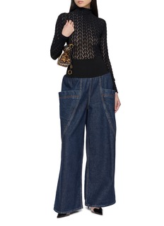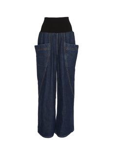 Alaïa reimagines utilitarian denim through a couture lens, pairing raw cotton denim with a sculpting ribbed knit waistband that contours the waist like a second skin. Oversized patch pockets and fluid wide legs lend ease and attitude—balancing comfort with architectural precision for elevated everyday wear.