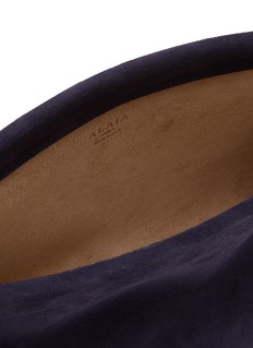 Crafted from sumptuous navy suede, this Alaïa handbag marries elegance with practicality. Its sleek, elongated silhouette is complemented by the adjustable strap, allowing for various styling options. Gold-tone hardware adds a luxurious touch, while the subtle embossed logo ensures sophistication. Ideal for day-to-evening versatility, this piece exemplifies Alaïa's commitment to timeless design and quality craftsmanship.
