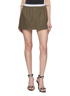 This Alexander Wang olive green mini skirt combines sporty elegance with functional design. Featuring a comfortable elastic waistband for a flexible fit, this skirt is crafted from a durable, smooth fabric that ensures longevity and ease of movement. The clean lines and minimalistic style make it a versatile addition to any wardrobe, perfect for pairing with a tucked-in blouse or a casual tee.