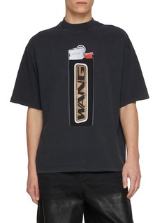 Alexander Wang redefines casual luxury with this bold black t-shirt, featuring a striking oversized lighter design with the brand's name in a shimmering gold appliqué. The relaxed fit and classic crew neckline enhance its streetwear appeal, making it a standout piece for any contemporary wardrobe. Crafted from soft, breathable cotton, this t-shirt offers both comfort and style. It's perfect for layering under a jacket or wearing solo to make a statement.