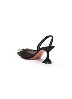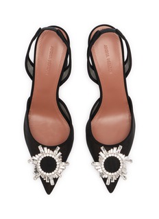 Elevate your evening attire with the Amina Muaddi heels, exquisitely designed with a sleek black mesh and luxurious crystal embellishments. The unique flared heel adds a contemporary twist to these classic slingbacks, perfect for a glamorous night out.