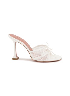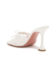 These alluring mules showcase Amina Muaddi's signature flared heel with an ethereal transparent upper adorned with delicate bow detailing. The sculptural silhouette blends architectural precision with romantic elegance, creating a captivating open-toe design. A showstopping style that brings contemporary sophistication to cocktail and evening occasions.