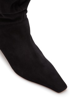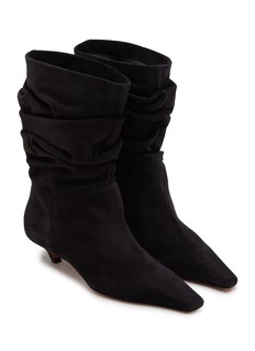 Embrace the epitome of chic sophistication with these Amina Muaddi boots, beautifully crafted from sumptuous black suede. The slouchy silhouette offers a modern twist on the classic boot, while the elegant pointed toe and delicate kitten heel provide a refined finish. Perfect for elevating any ensemble, these boots offer both style and versatility, making them a must-have for the fashion-forward wardrobe.