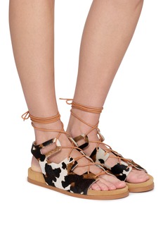 Ancient Greek Sandals draws from timeless Mediterranean craft to reimagine effortless elegance. This Flat Trata Sandal is crafted from premium cow-print ponyskin, with its signature hand-braided leather laces that wrap the ankle for a secure, personalized fit. The lightweight, contoured leather footbed ensures all-day comfort, while the natural cork midsole adds a subtle, artisanal touch.