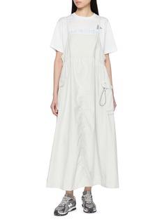 Utility reimagined in fluid proportion, this oversized cargo dress reflects and wander’s trail-born sensibility. Adjustable shoulder straps and a softly gathered waist create volume, while flap cargo pockets with carabiner detail anchor its technical identity. Layer over logo tees for urban exploration or weekend escapes.