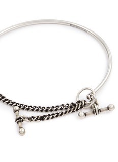 This Ann Demeulemeester necklace is a masterpiece of contrast and contemporary design, featuring a polished silver-tone segment complemented by a textured chain detail. The mixed-media approach not only provides visual interest but also embodies the label's avant-garde aesthetic.