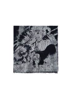 This striking Ann Demeulemeester scarf captures the essence of dramatic elegance, featuring a vivid black and white floral print set against a textured background. The intricate detailing and bold contrasts make this piece a powerful statement accessory. Crafted from a luxurious, soft fabric, it ensures comfort while providing ample warmth. The raw, frayed edges contribute to its edgy appeal, perfect for adding a touch of artistic sophistication to any ensemble.