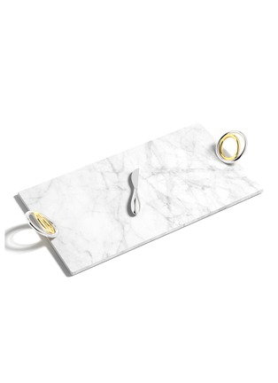 This cheese board and knife set from ANNA New York combines sleek marbled elegance with modern metallic accents. The infinity-shaped knife and dual ring handles add a touch of artistic flair, making it both a functional serving piece and a stylish centrepiece.