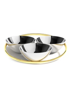 The Ring Conjoined Bowls are stable only when their gold ring encircles their silver bowls — a visual metaphor for the importance of community. Crafted from hand-polished stainless steel and solid brass, this set blends high style with high function. Ideal for serving dips, crudité, olives and even berries.