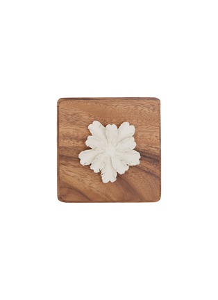 This elegant square acacia wood box features a wooden lid topped with a delicate hand-crafted porcelain flower. A refined blend of natural warmth and artisanal finesse, it's perfect for storing jewellery or small treasures — both functional and decorative.