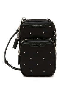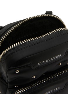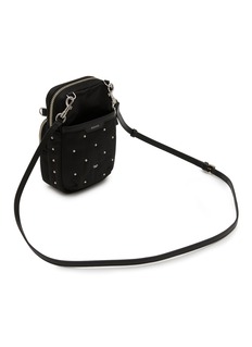 Introducing the Anya Hindmarch 'Essentials' crossbody bag, meticulously designed to keep your daily necessities organized and accessible. This compact yet functional piece is crafted from premium black leather, embellished with polished silver studs for a touch of elegance. The bag features clearly labeled compartments for sunglasses and essentials, ensuring everything has its place. The slender, adjustable strap offers comfortable, hands-free carrying, making it the ideal choice for busy days on the go. Perfect for those who appreciate organization without compromising on style.