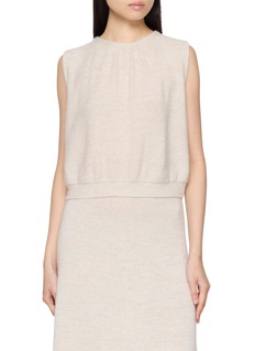 Subtly luminous with a softly structured drape, this sleeveless knit top is defined by its clean lines and delicate surface texture. Designed to skim the body with ease, it layers effortlessly or stands alone for refined daytime elegance and pared-back evening looks.