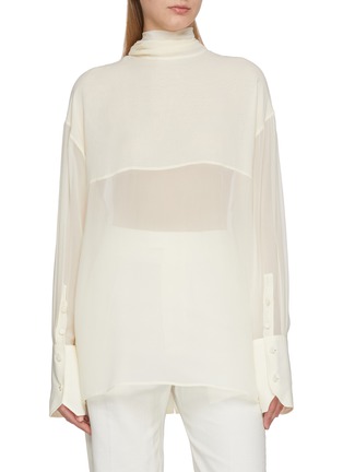 Airy and expressive, this silk georgette shirt by Armarium plays with proportion and movement through its reverse construction. The softly structured yoke defines the front, while a fluid scarf detail cascades at the back, offering versatile styling from understated elegance to sculptural drama.
