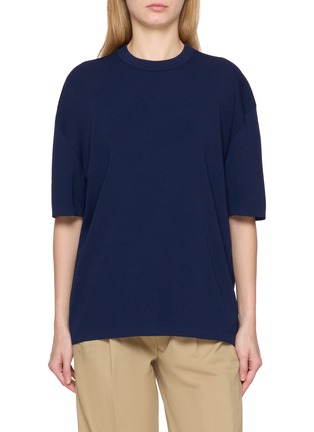 This Armarium top exemplifies effortless sophistication with its classic navy hue and clean lines. The piece is crafted from a soft, high-quality fabric that ensures comfort and durability. Its relaxed fit and elbow-length sleeves make it versatile for both casual and more dressed-up occasions. The round neckline adds a timeless touch, making it a staple item that pairs well with anything from tailored trousers to casual denim.