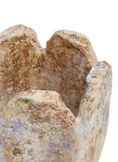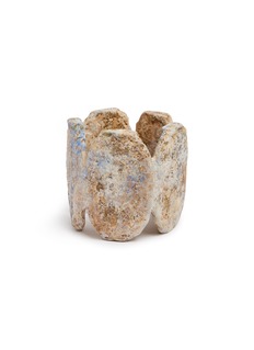Its structure, featuring multiple cylindrical forms joined together, creates an intriguing visual appeal, highlighted by a rustic finish in earthy tones and subtle blue accents. Designed to hold and heat tea using traditional methods, this stove is not only practical but also serves as a captivating decorative element in any tea lover's collection.