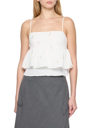 A study in soft structure, this sleeveless top balances airy volume with delicate detail. Tiered hems cascade from a gently shirred bust, dotted with three-dimensional floral beads that catch the light—ideal for summer evenings, gallery visits or refined daytime dressing.