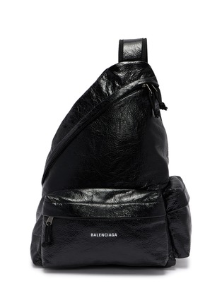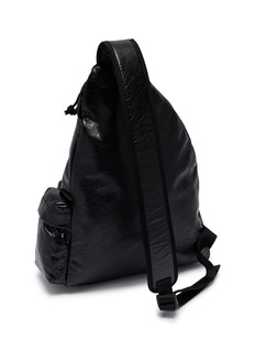 Balenciaga presents an oversized sling bag with crinkled finish and embossed logo detailing for urban utilitarian appeal. The spacious silhouette with multiple zip compartments and adjustable shoulder strap delivers hands-free functionality, while padded construction and signature branding create a statement accessory for contemporary streetwear-inspired styling.