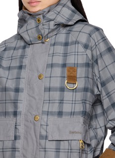 Barbour's statement jacket layers heritage check patterns with contrasting panels and textured corduroy trim. Distinctive details include oversized flap pockets, exposed zip hand-warmers, shoulder epaulettes, and D-ring hardware. The boxy silhouette with turn-back cuffs creates a bold, contemporary take on classic country outerwear.